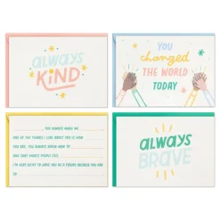 - Rainbow cover message: Thanks; Navy cover message: Thank You; Orange cover message: Hi Five; Cream cover message: Yay it’s your day!; Light blue cover message: Happy Day!; Coffee cup cover message: Take good care of you.