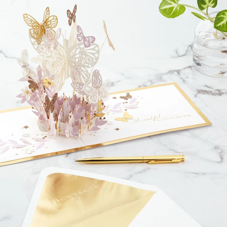 Pop-up thinking of you greeting card features a metallic gold foil butterfly and “thinking of you today” message on the front. Simply open the card to reveal the 3D pop-up surprise inside—no assembly required: intricate layers of laser-cut butterflies and flowers accented with sparkly glitter and shimmering gold foil pop out. This beautiful card crafted from premium card stock is a work of art sure to be displayed all year long, making it an unforgettable way to celebrate her birthday or Mother’s Day, or just to let a special friend know how much she’s appreciated—today and always. When open, this pop-up card lays flat for display; 3D pop-up inside measures approx. 6″ H.
