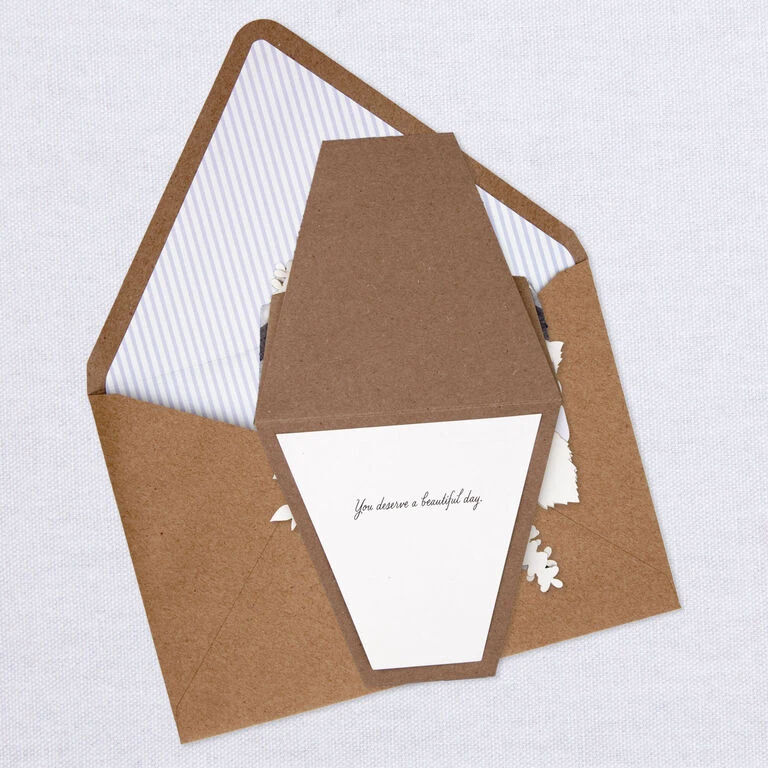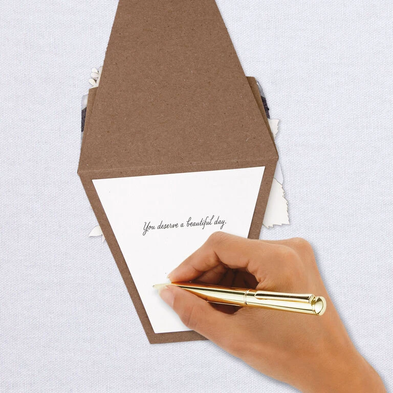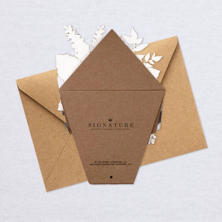Give them a bouquet they’ll cherish with this handcrafted, floral paper-art birthday card. Laser-cut flowers and leaves wrapped in striped tissue paper create a unique presentation. Kraft paper, jute twine and a die-cut tag attachment tie it all together. Flip the card open from the bottom to read the wish and leave open for a stand-up display.