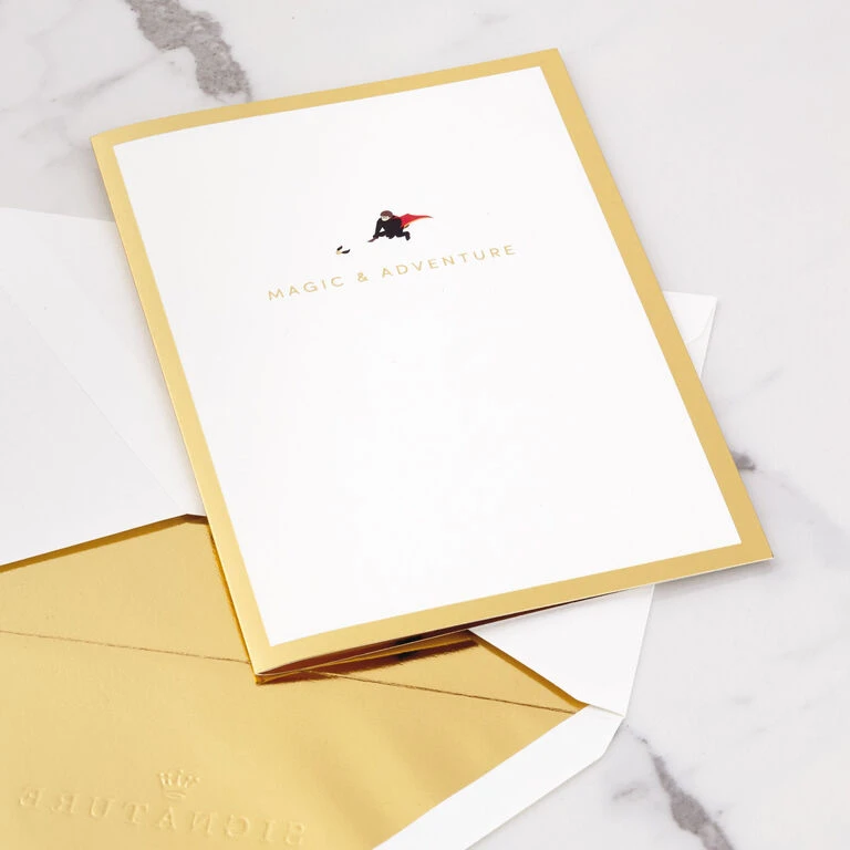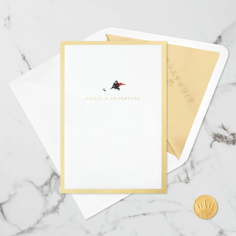 Pop-up greeting card features Harry Potter and the Golden Snitch in flight with a gold foil border and a “Magic & Adventure” message on the front. Simply open the card to reveal the 3D pop-up surprise inside—no assembly required: an intricate, laser-cut Hogwarts Castle pops out with Ron, Hermione and other favorite characters at the base while Harry pursues the Golden Snitch highlighted against a die-cut moon. Shimmering gold foil accents add to the fun. This exquisitely detailed card crafted from premium card stock is a work of art sure to be displayed all year long, making it an unforgettable way to surprise any Harry Potter fan on their birthday or just because. When open, this pop-up card lays flat for display; 3D pop-up inside measures approx. 3.25″ tall.