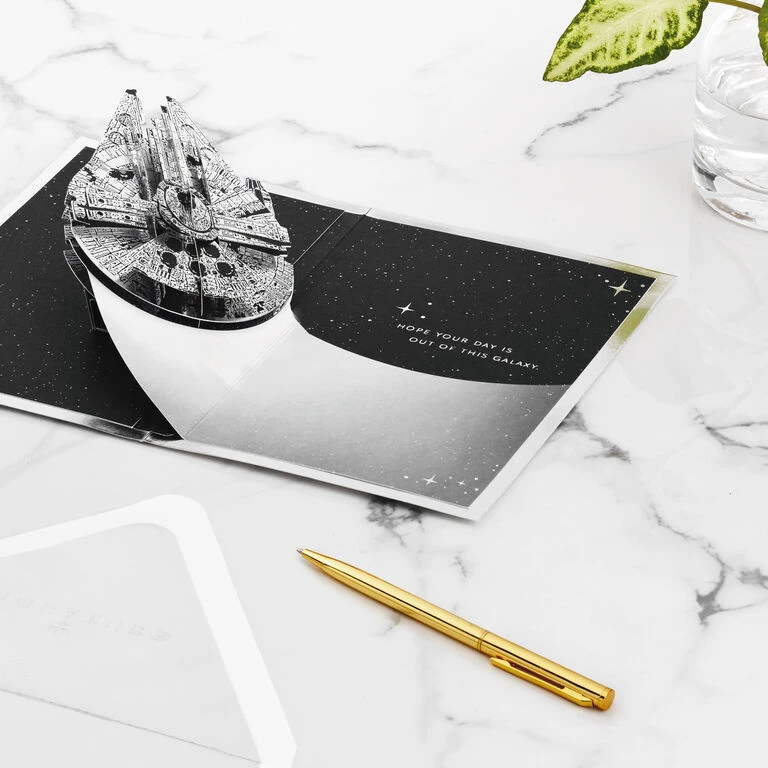 Pop-up greeting card features an image of the Millennium Falcon and a “May the Force be with you” message in silver foil on the front. Simply open the card to reveal the 3D pop-up surprise inside—no assembly required: an intricate, laser-cut Millennium Falcon pops out and the iconic ship appears to fly off into space. Silver foil accents and star icons add to the fun. This epic card crafted from premium card stock is a work of art sure to be displayed all year long, making it an unforgettable way to celebrate a Star Wars fan on Father’s Day, a birthday or any day. When open, this pop-up card lays flat for display; 3D pop-up inside measures approx. 2″ tall.